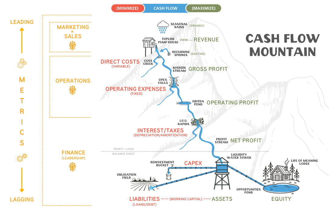 The Cash Flow Mountain is a visual model Amplify introduced in the webinar that shows how dollars actually move through a business, from revenue sources all the way down to what's left for real choices: investing, hiring, paying down debt, saving, and building a life you actually want.